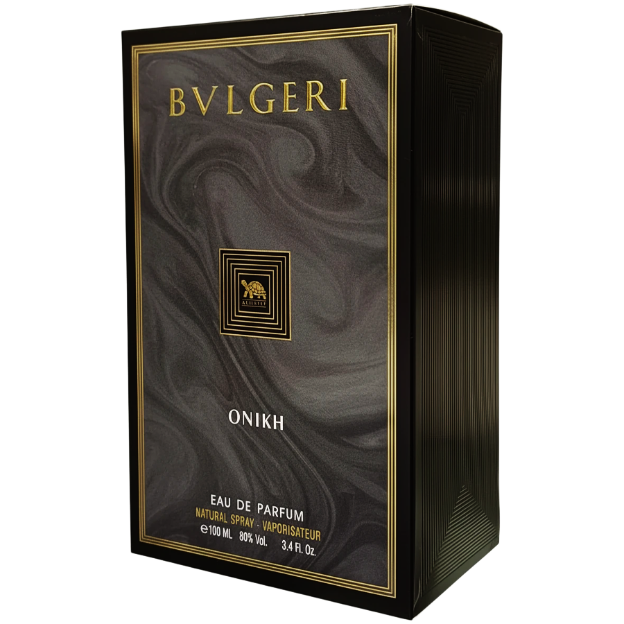 الحیات اونیخ در بخش طراحی ظاهری، کاملاً متعهد به شکل خاص و ابلیسکمانند (ستونهای هرمی) عطرهای کالکشن مردانه «ل جم» بولگاری عمل کرده است. بطری این عطر مشکی مات و مخروطیشکل است که حسی از صلابت و تاریکی سنگ اونیکس را منتقل میکند. نام عطر با املای "BVLGERI ONIKH" با رنگ طلایی روی بدنه درج شده و لوگوی لاکپشت الحیات در زیر آن میدرخشد. درب بطری نیز مشکی و استوانهای بوده و با یک نوار طلاییرنگ در پایه تزیین شده است. در بخش بستهبندی، جعبهای بسیار شکیل با پسزمینه طرح مرمر دودی و هالههایی از رنگهای مشکی و خاکستری (یادآور سنگهای قیمتی تیره) طراحی شده است. حاشیههای طلاییرنگ و لوگوی لاکپشت در مرکز یک مربع تو در تو، جلوهای بسیار لوکس به جعبه بخشیده است. در پشت جعبه نیز نشان تجاری تونی مونتانا (Tony Montana) با رنگ طلایی خودنمایی میکند.