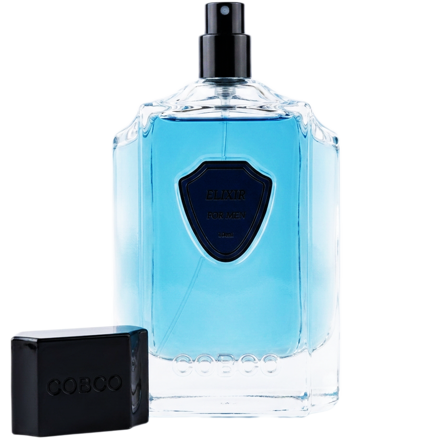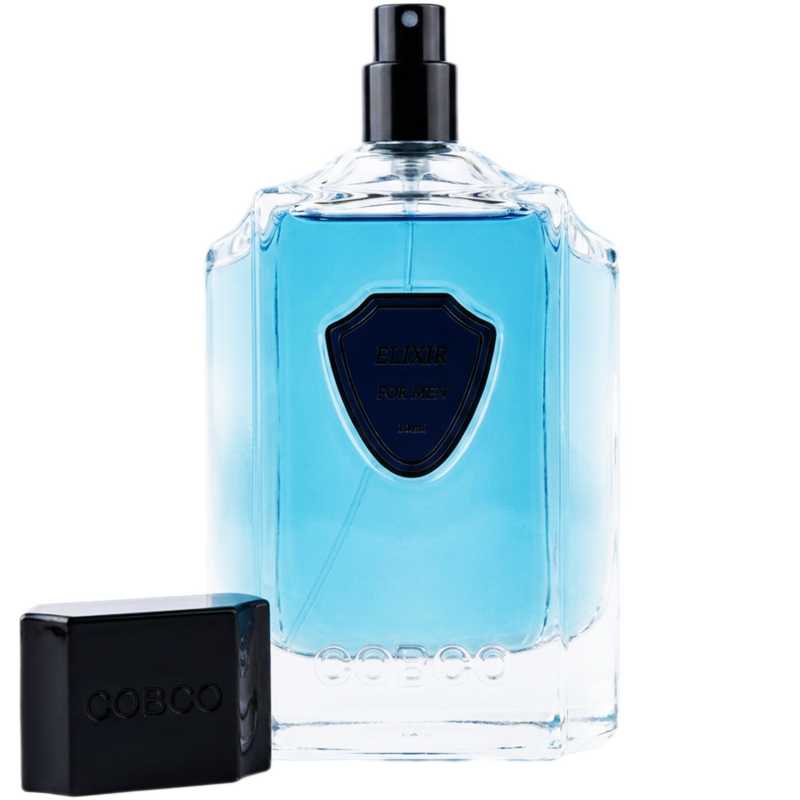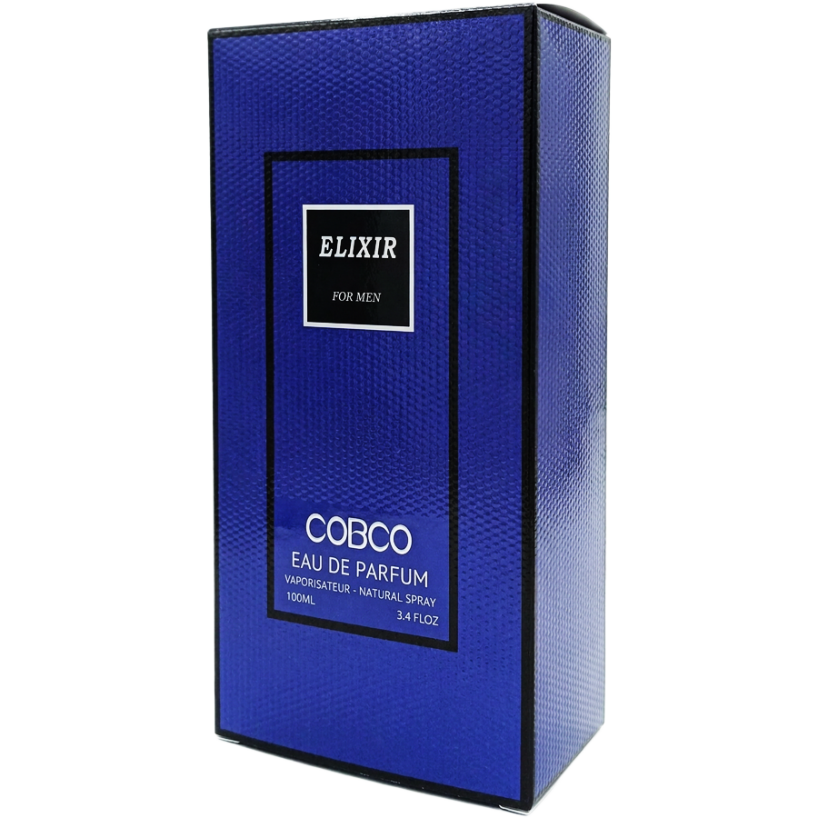 ظاهر این عطر به شدت کلاسیک و در عین حال شیک است. جعبهی مقوایی عطر با رنگ آبی تیره (سرمهای) و بافتی جذاب طراحی شده که نام ELIXIR درون یک کادر مشکی روی آن خودنمایی میکند. بطری عطر، یک شیشهی شفاف و خوشتراش با لبههای زاویهدار است که مایع آبیرنگ و زیبای عطر درون آن به خوبی پیداست. روی شیشه، یک پلاک سرمهایرنگ به شکل سپر (Shield) قرار گرفته که نام عطر روی آن نوشته شده است. نام برند COBCO نیز با ظرافتِ تمام در قسمت پایینِ شیشه حک و برجسته شده است. درپوش مشکی و کلاسیک آن نیز تکمیلکنندهی این ظاهر مردانه و باوقار است.