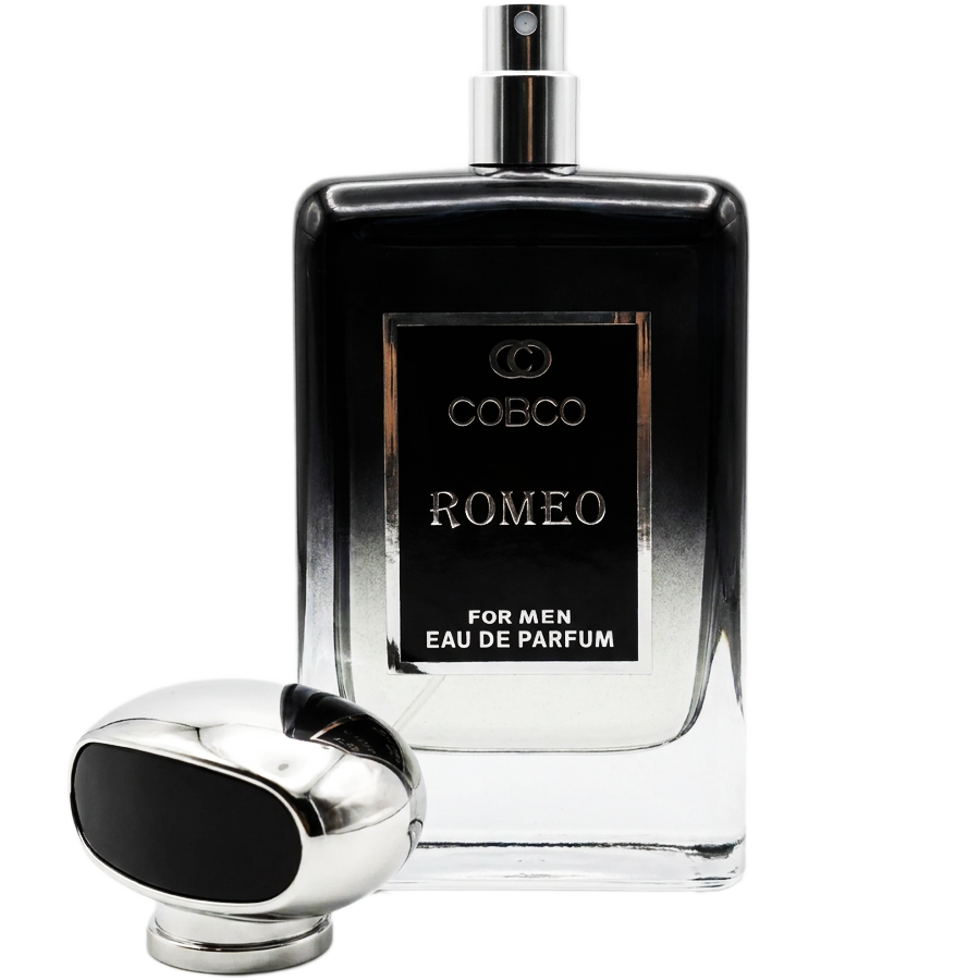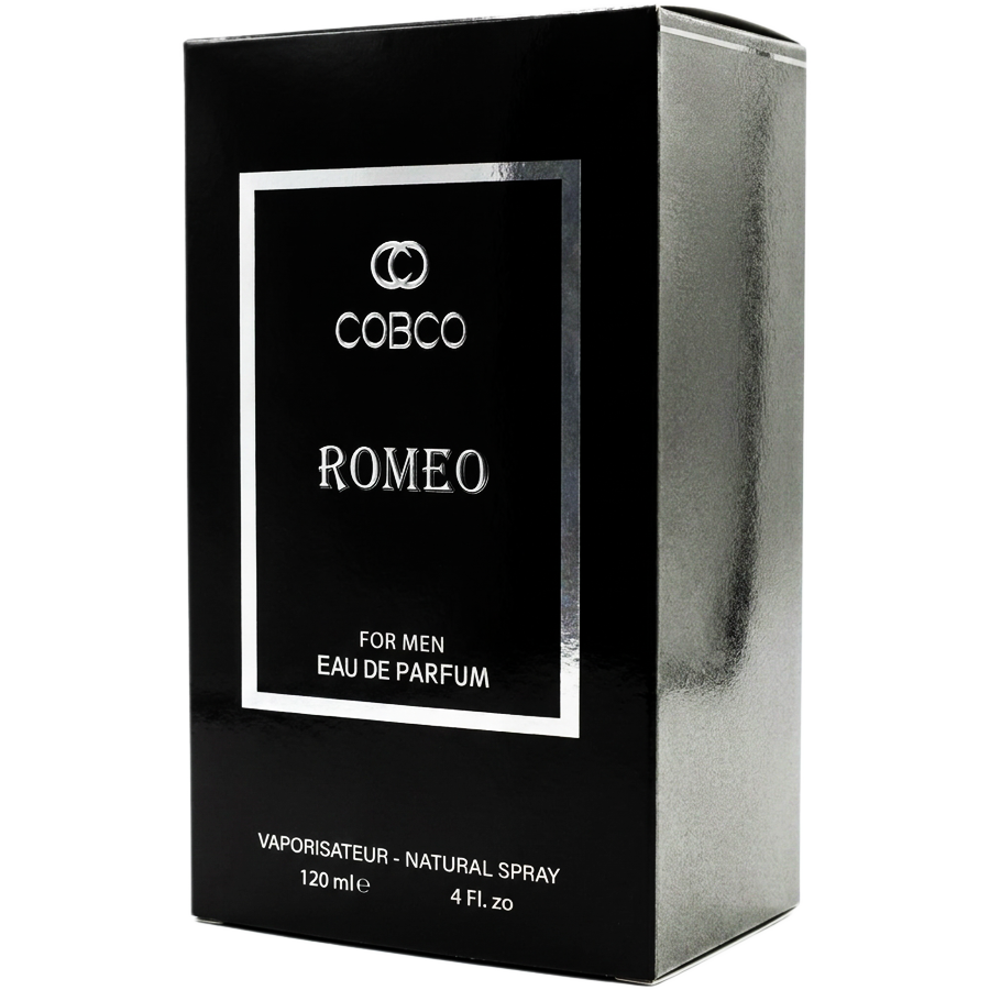 طراحی بطری و بستهبندی کوبکو رومئو، شیک، مردانه و بسیار چشمنواز است. جعبهی عطر به رنگ مشکی براق با یک کادر نقرهایرنگ طراحی شده که نام برند COBCO و مدل ROMEO با فونتی کلاسیک و برجسته روی آن نقش بسته است. بطری شیشهای عطر دارای یک طیف رنگی بسیار زیباست؛ از مشکی تیره در قسمت بالا شروع شده و در پایین بطری به صورت شفاف درمیآید تا مایع عطر به خوبی قابل مشاهده باشد. روی شیشه نیز یک پلاک مستطیلی مشکی با حاشیهی نقرهای قرار گرفته است. درپوش عطر با طراحی بیضیشکل و خاص خود، ترکیبی از رنگهای نقرهای براق و مشکی است که هارمونی بینظیری با کل مجموعه ایجاد کرده و ظاهر آن را برای قرار گرفتن روی میز آرایش شما، بسیار لوکس جلوه میدهد.