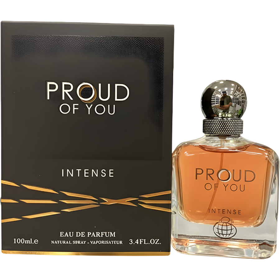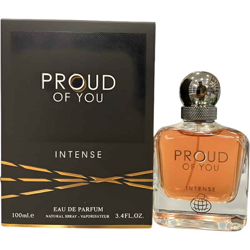 پرود آف یو اینتنس، همانطور که از نامش پیداست (اینتنس)، تفسیری غلیظتر، شیرینتر و نافذتر از رایحهٔ اصلی یو است. این ادوپرفیوم از برند شرکتی فراگرنس ورد (Fragrance World)، با رایحهای بسیار گرم، شیرین و شرقی، برای مردانی طراحی شده که به دنبال یک امضای بویایی پرقدرت، اغواگر و پر سر و صدا برای شبهای سرد هستند. Intense بیانگر حضور پرحرارت و غیرقابل مقاومت است. عطر پرود آف یو اینتنس از برند فراگرنس ورد، رایحهای مشابه استرانگر ویت یو اینتنسلی جورجیو آرمانی (Stronger With You Intensely Giorgio Armani) دارد.