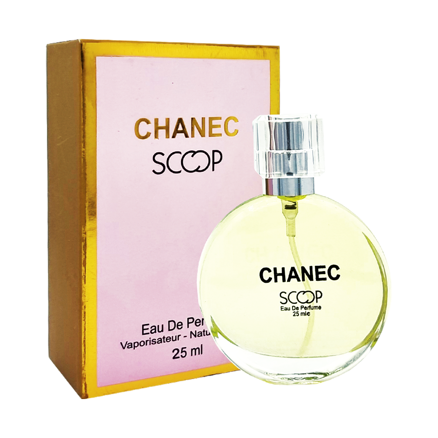 در بخش طراحی ظاهری، اسکوپ چنس کاملاً از زبان طراحی نسخه اصلی الهام گرفته است. بطری نسخه 100 میلیلیتری به شکل دایرهای، تخت و شفاف طراحی شده که مایع زرد و روشن درون آن به خوبی نمایان است. نام "CHANEC" و لوگوی برند "SCOOP" با فونتی خوانا روی شیشه نقش بسته است. درب بطری به شکل یک مکعب مشکی است که هارمونی خوبی با طراحی کلی دارد. جعبه عطر نیز با رنگ صورتی ملایم و حاشیههای طلاییرنگ براق، کاملاً یادآور بستهبندی شیک و کلاسیک شنل چنس است. نکته بسیار مثبت و کاربردی در مورد این محصول، عرضه آن در دو حجم متفاوت است. علاوه بر شیشه 100 میلیلیتری که برای استفاده روی میز آرایش مناسب است، یک نسخه مینیاتوری 25 میلیلیتری (عطر جیبی) نیز با همان فرمولاسیون و طراحی مشابه (با دربی شفاف) تولید شده است که برای حمل در کیف دستی و تمدید عطر در طول روز و مسافرتها بسیار ایدهآل است.