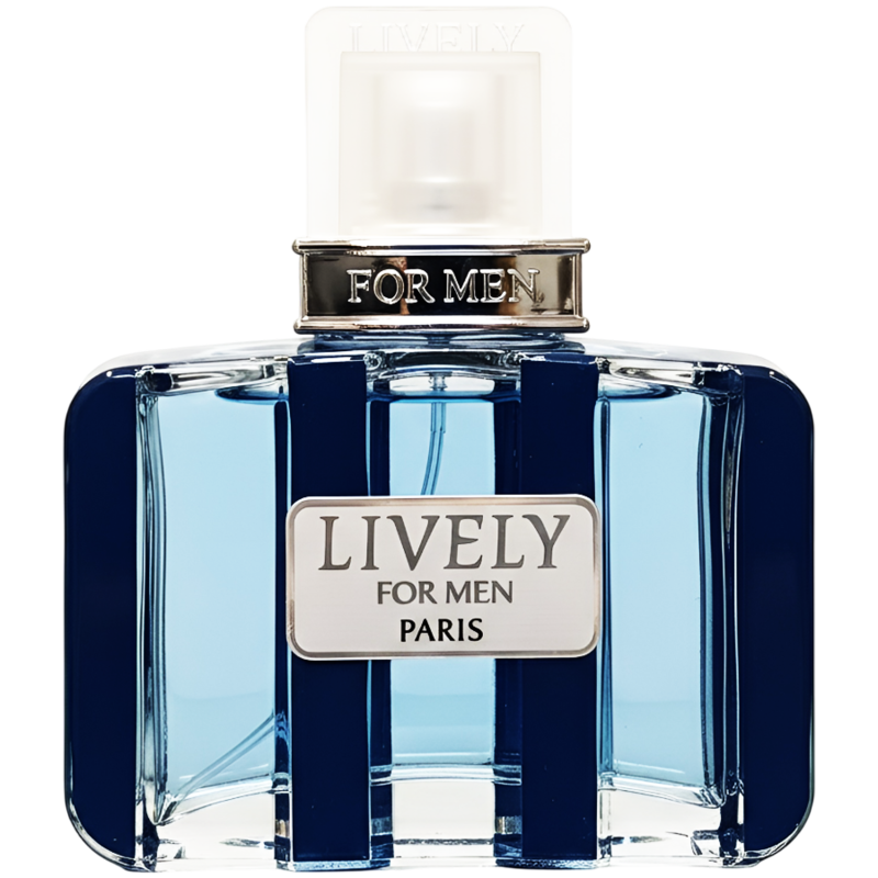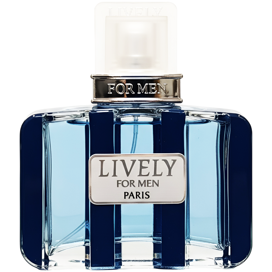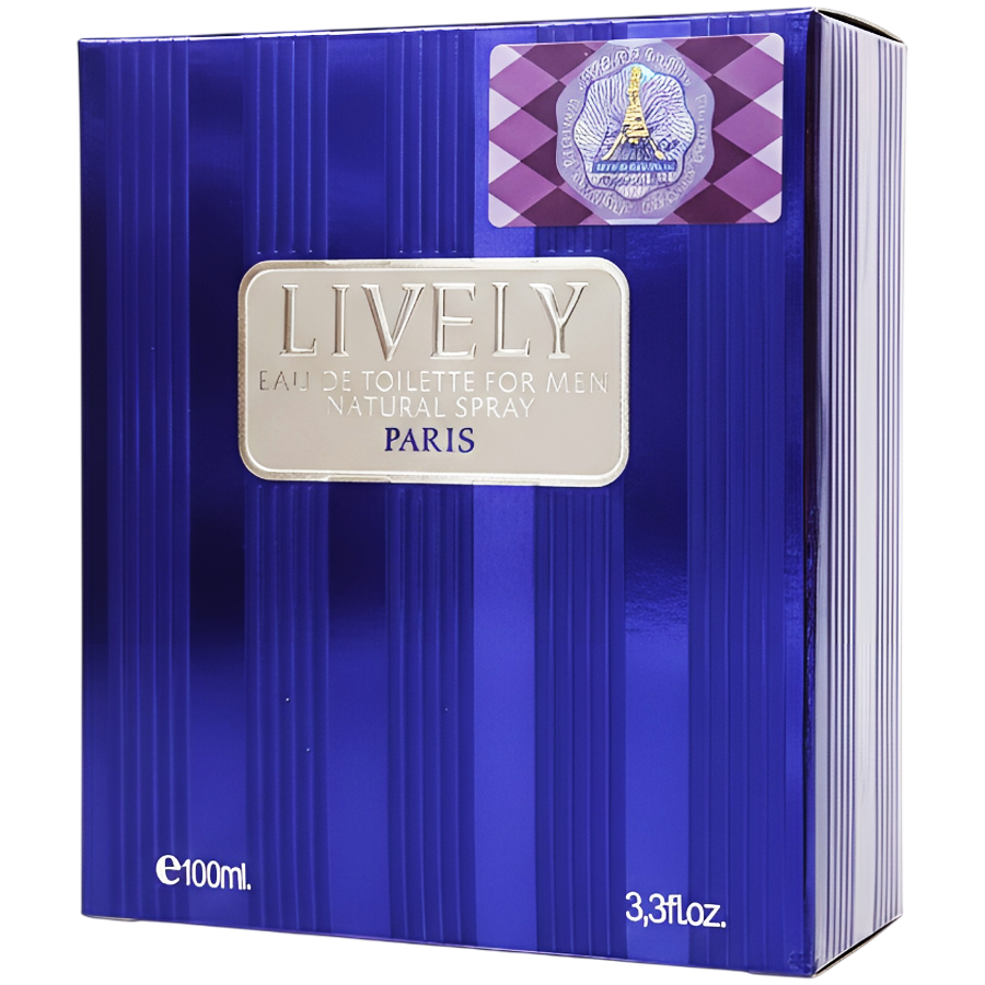 * جزئیات و درپوش: در وسط بطری، یک پلاک نقرهای مستطیل شکل قرار دارد که نام LIVELY FOR MEN PARIS بر روی آن حک شده است. درب بطری شفاف است و بر روی پایه نقرهایرنگی سوار شده که عبارت FOR MEN بر روی آن خودنمایی میکند.